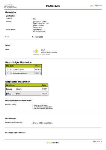 Digitalny dziennik budowy z geoCapture ułatwia tę pracę. Personel, maszyny i pogoda są automatycznie